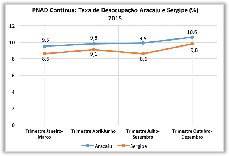 Sergipe encerrou o terceiro trimestre (outubro, novembro e dezembro) de 2015 com uma taxa de desocupação de 9,8%, o que corresponde a 100 mil cidadãos sem trabalho, ou exercendo trabalhos irregulares, sem carteira assinada, o que é considerado um grande contingente de pessoas.