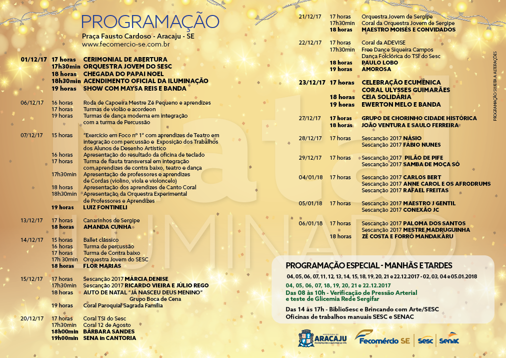 No período de 01/12/2017 a 06/01/2018, firmamos uma parceria com a prefeitura de Aracaju e demais instituições que compõem o Sistema Fecomércio/Sesc/Senac para a realização do Projeto “Natal Iluminado”. Decidimos presentear a cidade de Aracaju com a ornamentação natalina da Praça Fausto Cardoso.