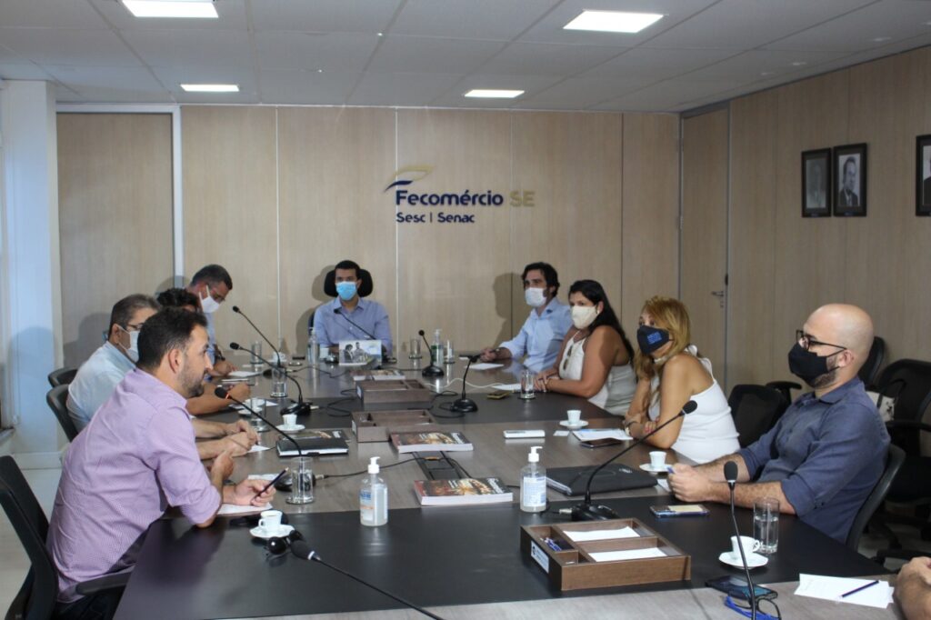 Participaram da reunião, o superintendente do Sistema Fecomércio/Sesc/Senac, Maurício Gonçalves, o presidente da ABRAPE-SE, Gustavo Paixão, a coordenadora geral do Ministério do Turismo, Clarissa Valadares e o presidente da Abrasel-SE, Bruno Dórea.