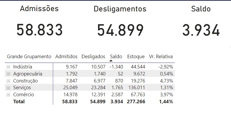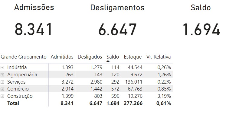 Todas as atividades econômicas apresentaram crescimento em agosto, sendo o setor da construção civil o líder do mês, com 596 novas contratações, seguido de perto pelo comércio, com 572 empregos gerados, serviços com 292, agronegócio com 120, e a indústria com 114 novos postos de trabalho com carteira assinada. Agosto é o quinto mês seguido com saldo positivo de emprego no ano de 2021. O exercício deste ano, entre janeiro e agosto aponta o crescimento de 3.934 novos empregos.